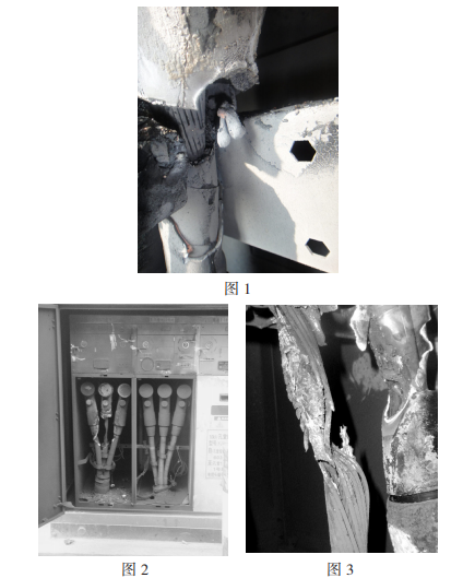 2009年2月15日,回南天,仙村站孔堂線在經(jīng)歷了長達(dá)18分鐘的間歇性接地后速斷跳閘,重合不成功,K5013-0003X電纜分支箱601開關(guān)B相進(jìn)線電纜終端應(yīng)力錐處首先短路燒毀(如圖2)。據(jù)分支箱附近商鋪店主反映,箱內(nèi)曾繼續(xù)宣布嘩啪的響聲并冒煙,終究傳出爆炸聲音。經(jīng)開始剖析,事端原發(fā)點為B相應(yīng)力錐尾部,因為密封不嚴(yán),硅脂固化,在運(yùn)轉(zhuǎn)環(huán)境濕度較大的情況下呈現(xiàn)凝露,水氣進(jìn)入纜芯,導(dǎo)致絕緣強(qiáng)度破壞產(chǎn)生爬電。終究由間歇性接地發(fā)展到三相短路(如圖3)。此次故障相同導(dǎo)致分支箱氣室破損泄漏,分支箱報廢。