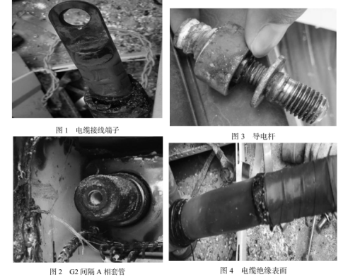 搶修人員對G2間隔電纜拆除后,發(fā)現(xiàn)電纜接線端子(如圖1所示)氧化嚴重,說明此處遭受過高溫侵蝕,并且應力錐靠近端子處的燒蝕痕跡也說明了插頭受高溫侵蝕;現(xiàn)場發(fā)現(xiàn)端子與環(huán)氧套管銅件的接觸面存在明顯氧化,說明高溫侵蝕時,端子與環(huán)氧套管銅件表面并未完全緊密貼合;檢查套管內(nèi)部螺紋亮光正常(如圖2所示),說明導電桿安裝緊固。環(huán)氧套管遭受高溫痕跡明顯,且銅件表面與端子接觸面也有很明顯氧化痕跡,說明在高溫發(fā)生時,端子與環(huán)氧套管銅件表面并未完全緊密貼合;現(xiàn)場對導電桿(如圖3所示)進行檢查,發(fā)現(xiàn)變徑螺桿氧化,以及銅嵌件脫離環(huán)氧,熔融附于變徑螺桿上,都說明此處經(jīng)受過高溫傳導;對電纜應力錐剝除后,發(fā)現(xiàn)電纜絕緣表面(如圖4所示)無明顯爬電痕跡,說明應力體部位未發(fā)生爬電故障,從絕緣受高溫侵蝕和燒蝕判斷,高溫來自端子部位。