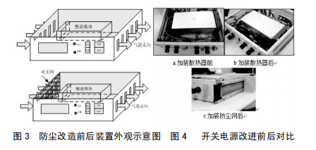 (2)在裝置本體進風(fēng)孔加防塵網(wǎng),防止灰塵進入裝置內(nèi)部,設(shè)備維護人員定期對濾網(wǎng)進行清掃,從而減輕元器件表面覆塵,利于裝置正常散熱,如圖3所示加裝防塵網(wǎng)后開關(guān)電源示意圖。對裝置實施上述改進后,其改進前后對比如圖4所示。